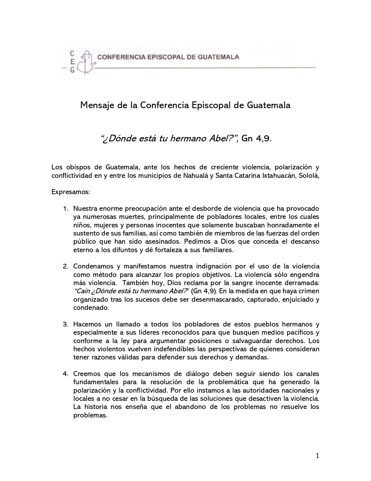 Comunicados 220108-Conferencia Episcopal de Guatemala-Ante los hechos de creciente violencia Felipe Monroy 08 كانون2/يناير 2022 Share On Facebook Share On Twitter Category Comunicados Hits 1458 times السابق التالي tweet