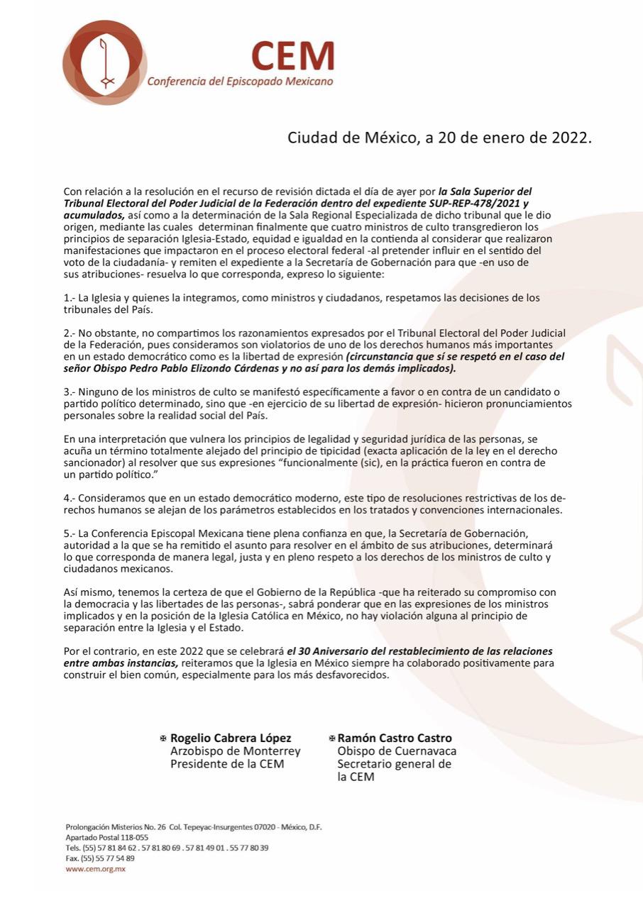 Comunicados 220120-Conferencia del Episcopado Mexicano-Con relación a la resolución TEPJF Felipe Monroy 20 كانون2/يناير 2022 Share On Facebook Share On Twitter Category Comunicados Hits 1779 times السابق التالي tweet