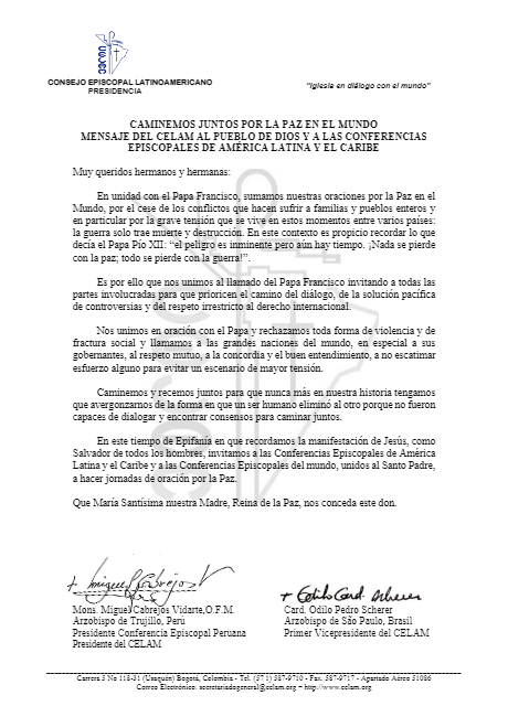 A través de un comunicado "Caminemos Juntos por la Paz en el Mundi" firmado por el presidente del CELAM, Miguel Cabrejos, arzobispo de Trujillo, y los miembros del Consejo, los obispos pidieron a los fieles orar "por la grave tensión que se vive en estos momentos entre varios países". Recordaron a los líderes de estas naciones que la guerra "solo trae muerte y destrucción", les pidieron mirar a las familias y a sus puebles por ser quienes sufren fatalmente las decisiones militares.