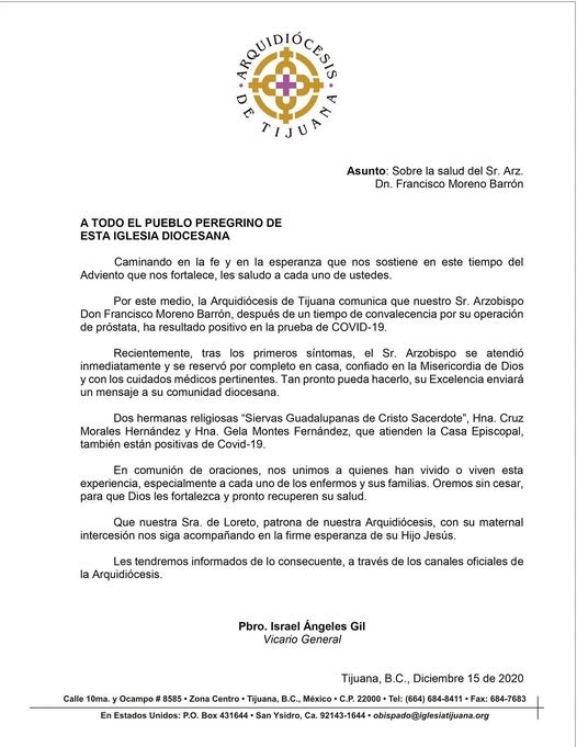 COMUNICADO: 201215-Arquidiócesis de Tijuana-Arzobispo Francisco Moreno Barrón positivo a COVID