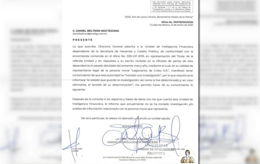 La UIF respondió mediante su directora general adscrita (cuyo nombre está reservado por razones de seguridad nacional hasta el 2024) al representante legal de la asociación religiosa Legionarios de Cristo, Daniel Beltrán Moctezuma, el 21 de enero a través del oficio 110/F/B/502/2020.
