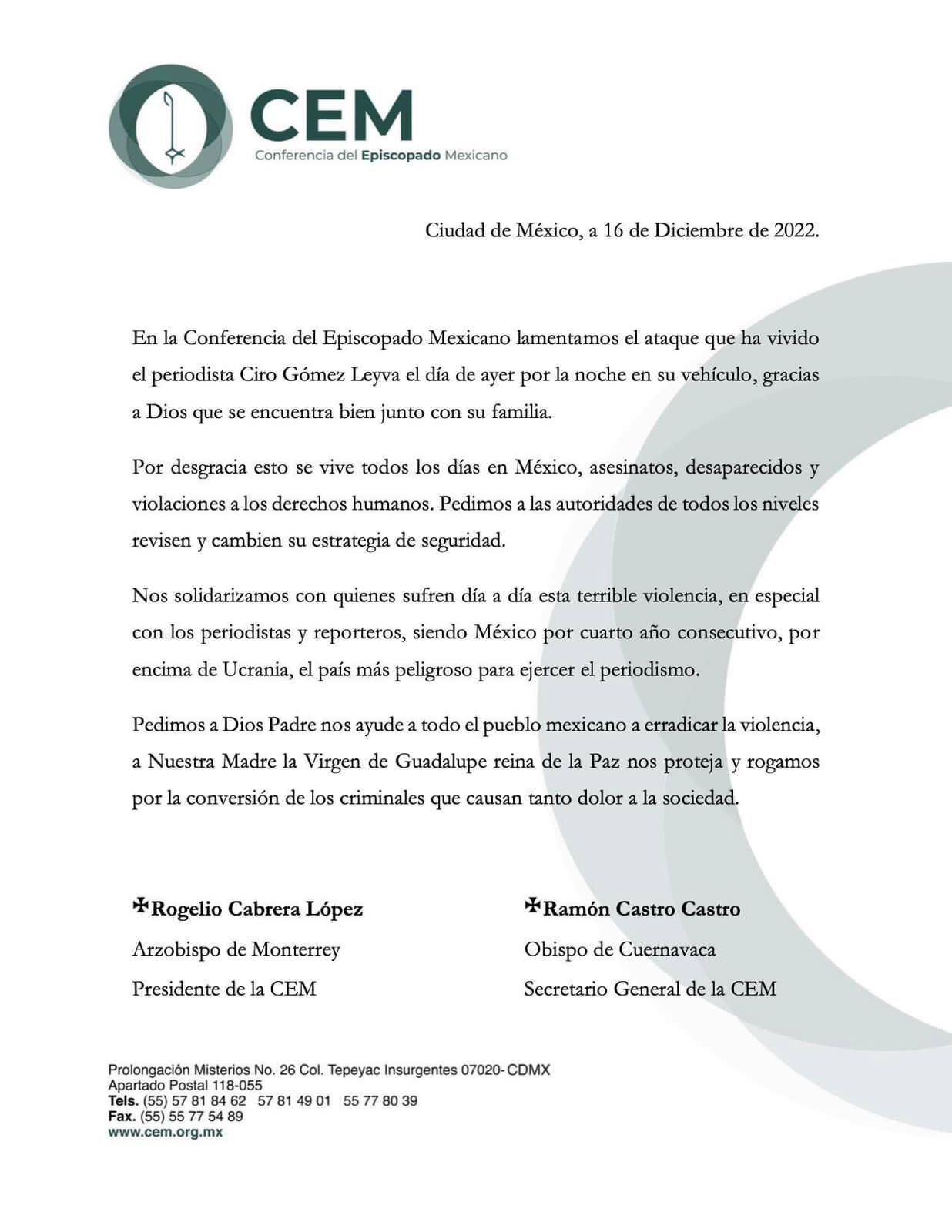 "Lamentamos el ataque que ha vivido el periodista Ciro Gómez Leyva el día de ayer por la noche en su vehículo, gracias a Dios se encuentra bien con su familia", declararon las autoridades eclesiásticas.