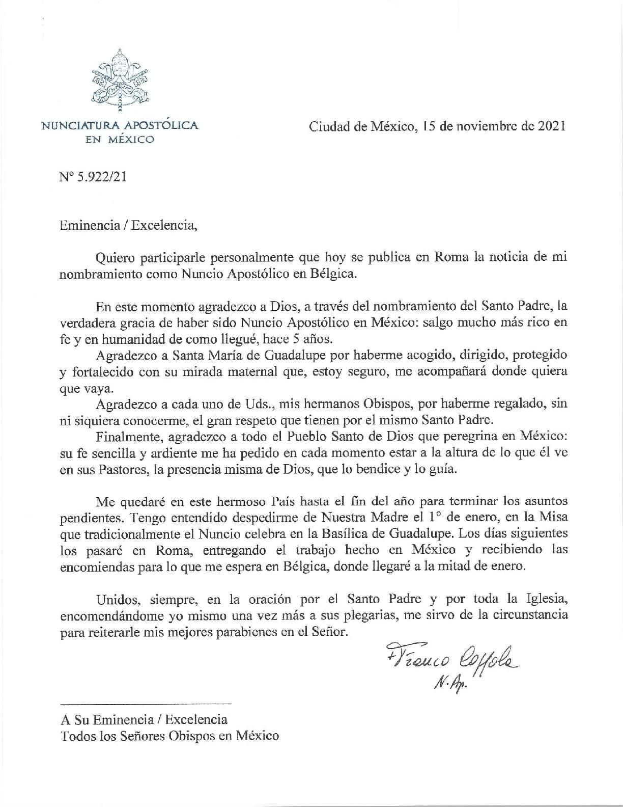 Tras conocerse su nuevo nombramiento, Coppola dirigió una carta a la Nunciatura Apostólica en México en la que reconoce que deja nuestro país más rico en fe y en humildad que cuando llegó.