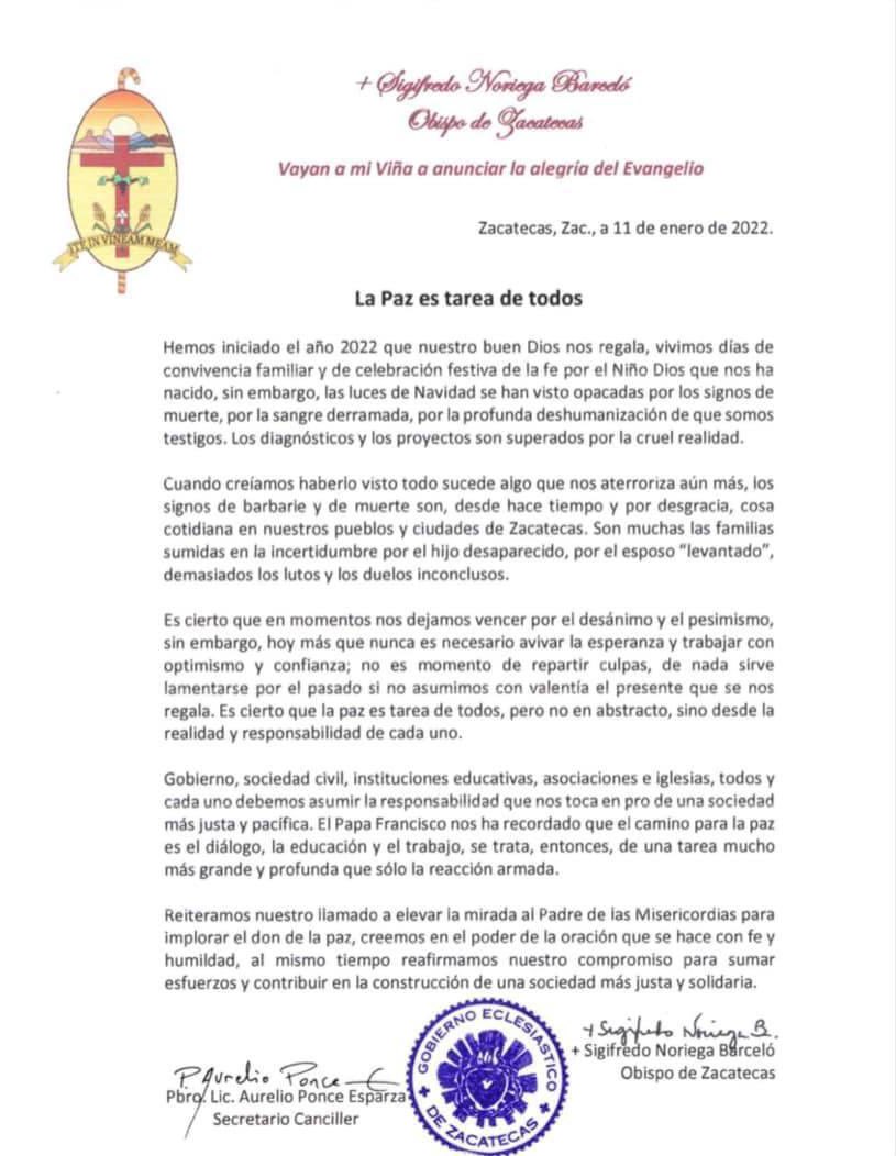 Comunicados 220111-Sigifredo Noriega Barceló, obispo de Zacatecas-La paz es tarea de todos Felipe Monroy 11 Enero 2022 Share On Facebook Share On Twitter Category Comunicados Hits 1775 times Anterior Siguiente tweet