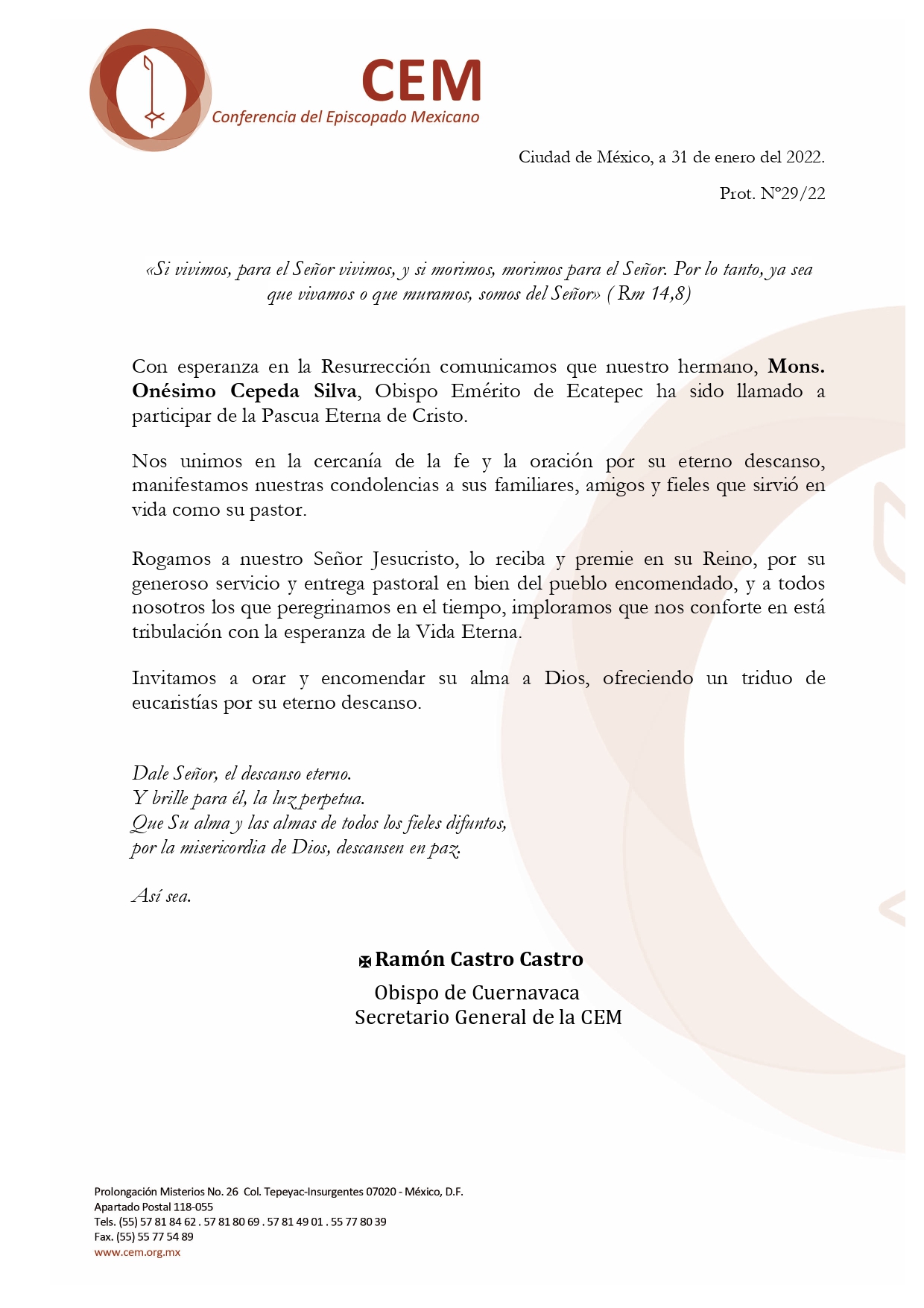Comunicados 220131-Conferencia del Episcopado Mexicano-Fallecimiento Mons. Onésimo Cepeda Silva Felipe Monroy 31 Enero 2022 Share On Facebook Share On Twitter Category Comunicados Hits 1643 times Anterior Siguiente tweet