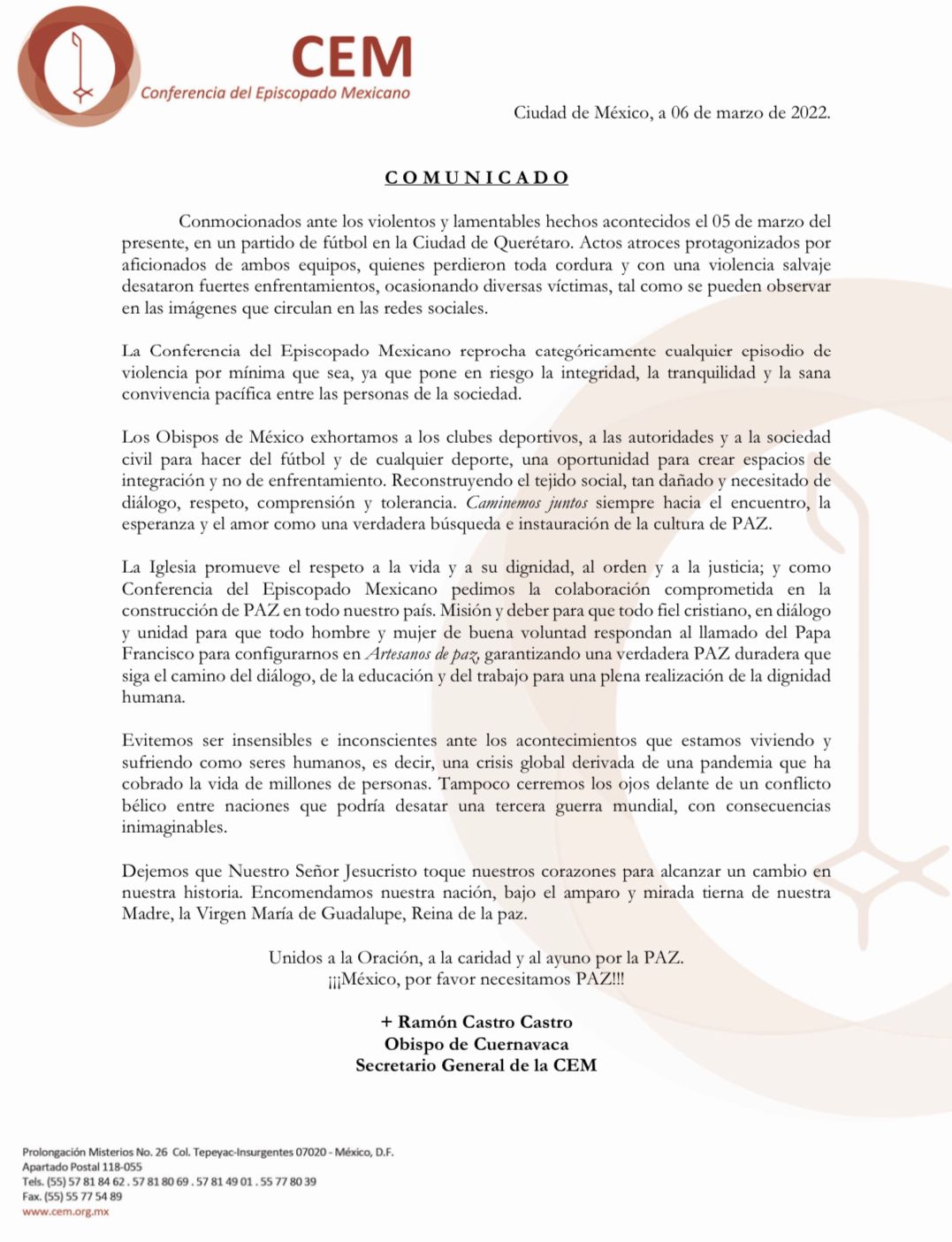 Comunicados 220306-Conferencia del Episcopado Mexicano-Comunicado ante los violentos hechos en un partido de futbol Felipe Monroy 06 Marzo 2022 Share On Facebook Share On Twitter Category Comunicados Hits 1472 times Anterior Siguiente tweet