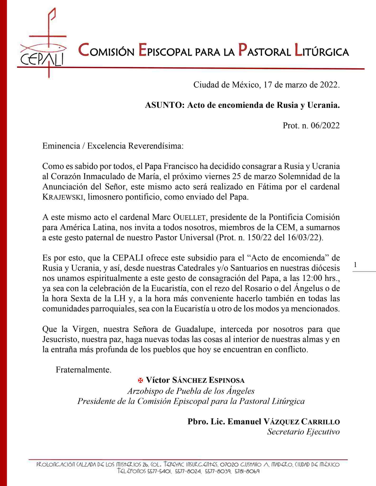 Comunicados 220317-Comisión Episcopal Pastoral Litúrgica-Acto de encomienda de Rusia y Ucrania Felipe Monroy 17 Marzo 2022 Share On Facebook Share On Twitter SUBSIDIO PARA EL ACTO DE ENCOMIENDA POR RUSIA Y UCRANIA Category Comunicados Hits 1530 times Anterior Siguiente tweet