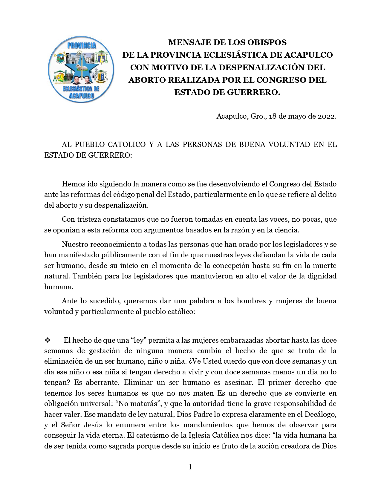 Comunicados 220518-Provincia Eclesiástica de Acapulco-Con motivo de la despenalización del aborto realizada por el Congreso del Estado de Guerrero Felipe Monroy 18 Mayo 2022 Share On Facebook Share On Twitter Category Comunicados Hits 1613 times Anterior Siguiente tweet