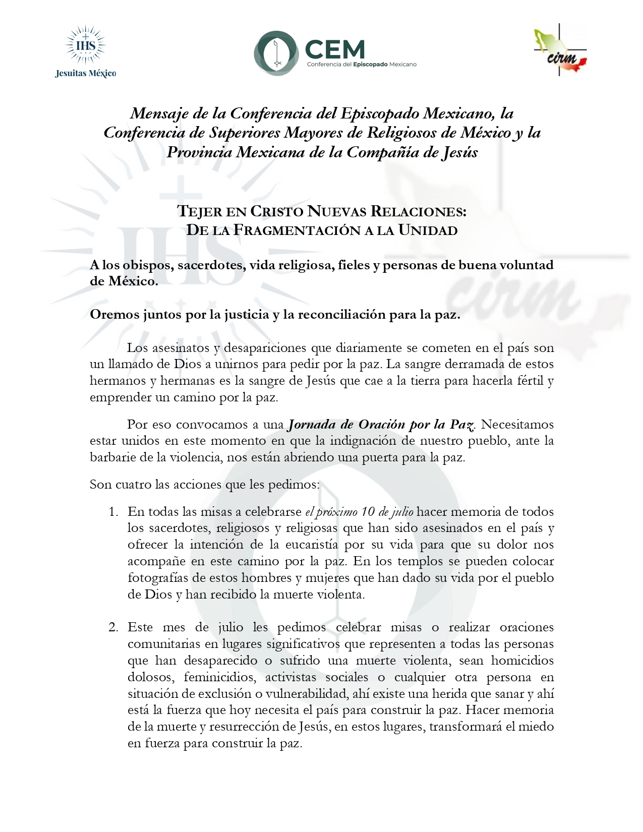 Comunicados 220704-CEM, CIRM, Compañía de Jesús en México-Tejer en Cristo nuevas relaciones: De la fragmentación a la unidad Felipe Monroy 05 Julio 2022 Share On Facebook Share On Twitter Category Comunicados Hits 1528 times Anterior Siguiente tweet
