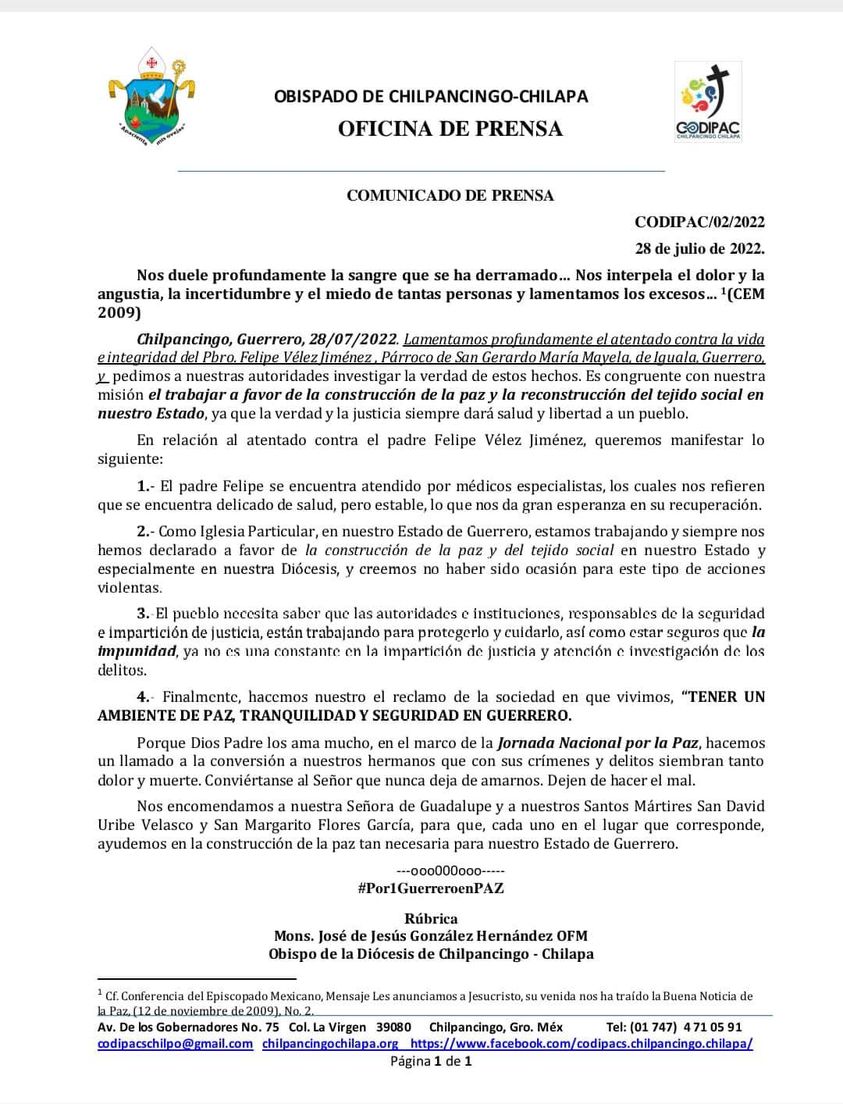 Comunicados 220728- Diócesis de Chilpancigo-Chilapa - Atentado contra el Pbro. Felipe Vélez Jiménez Felipe Monroy 28 Julio 2022 Share On Facebook Share On Twitter Category Comunicados Hits 1380 times Anterior Siguiente tweet