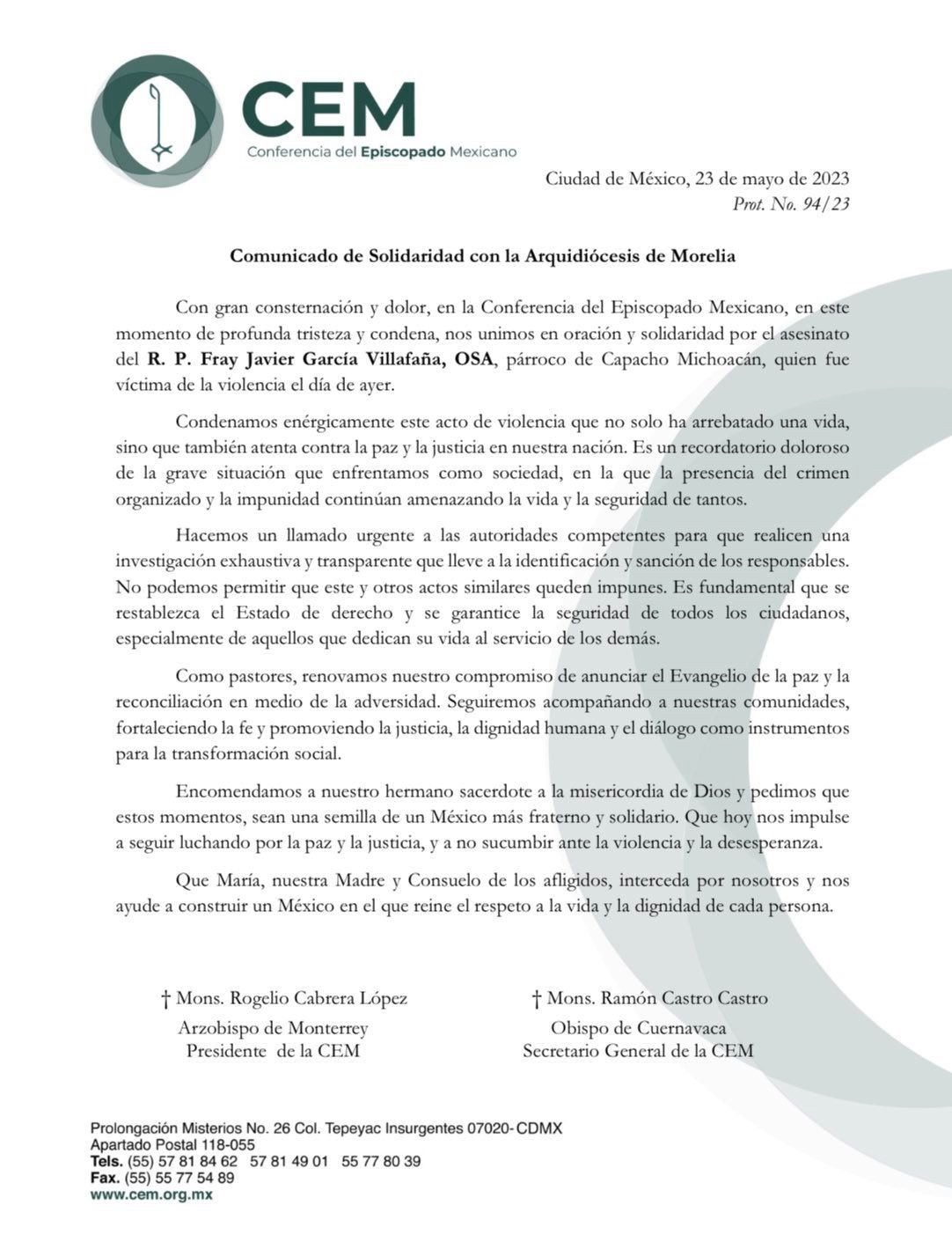 Comunicados 230523-Conferencia del Episcopado Mexicano-Solidaridad con la Arquidiócesis de Morelia Felipe Monroy 23 Mayo 2023 Share On Facebook Share On Twitter Category Comunicados Hits 1303 times Anterior Siguiente tweet