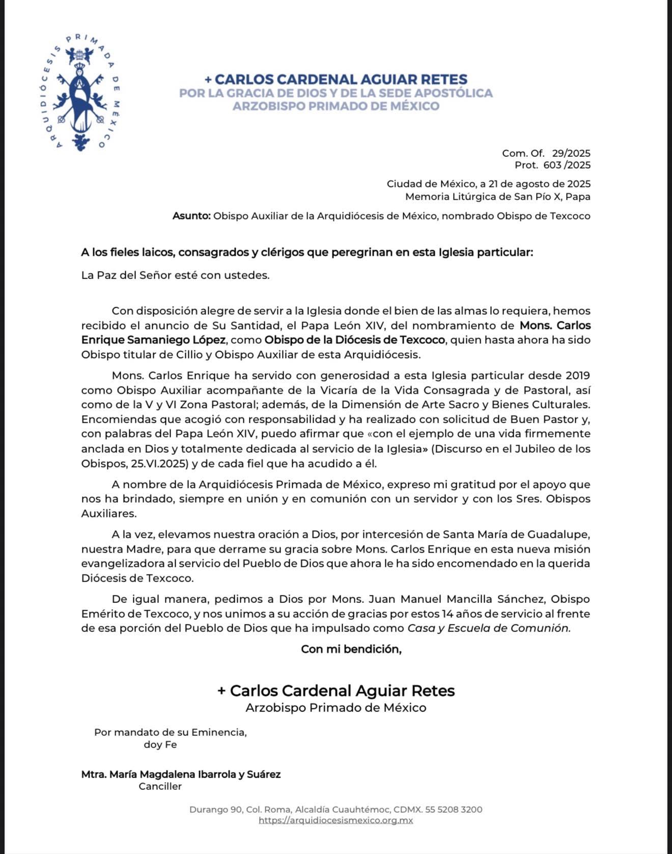 Comunicados 250821-Carlos Cardenal Aguiar Retes-Obispo Auxiliar de la Arquidiócesis de México, nombrado Obispo de Texcoco Felipe Monroy 21 Agosto 2025 Share On Facebook Share On Twitter Category Comunicados Hits 474 times Anterior Siguiente tweet