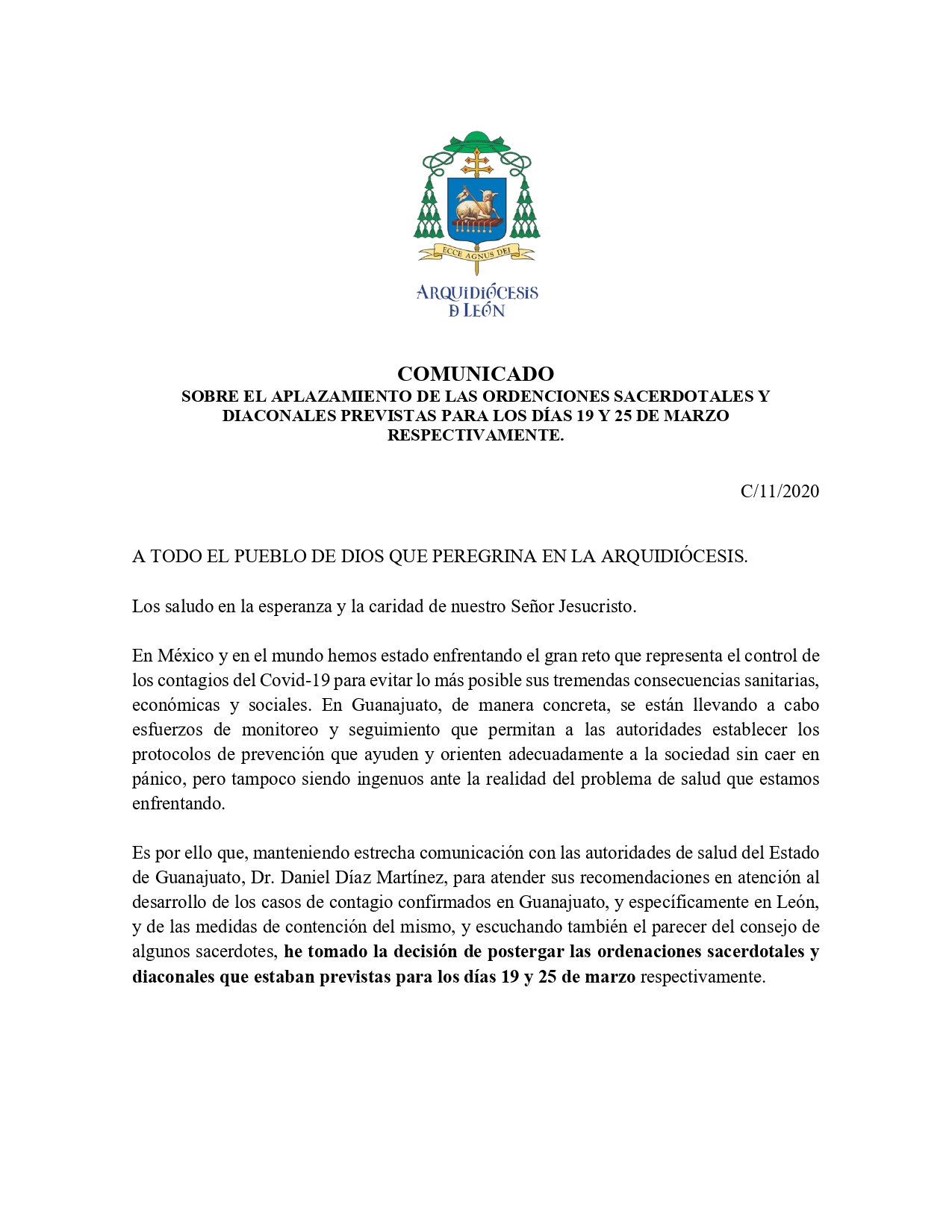 Comunicados 200316-Arquidiócesis de León-Sobre el aplazamiento de las ordenaciones sacerdotales y diaconales Felipe Monroy 16 Marzo 2020 Share On Facebook Share On Twitter Category Comunicados Hits 1704 times Anterior Siguiente tweet