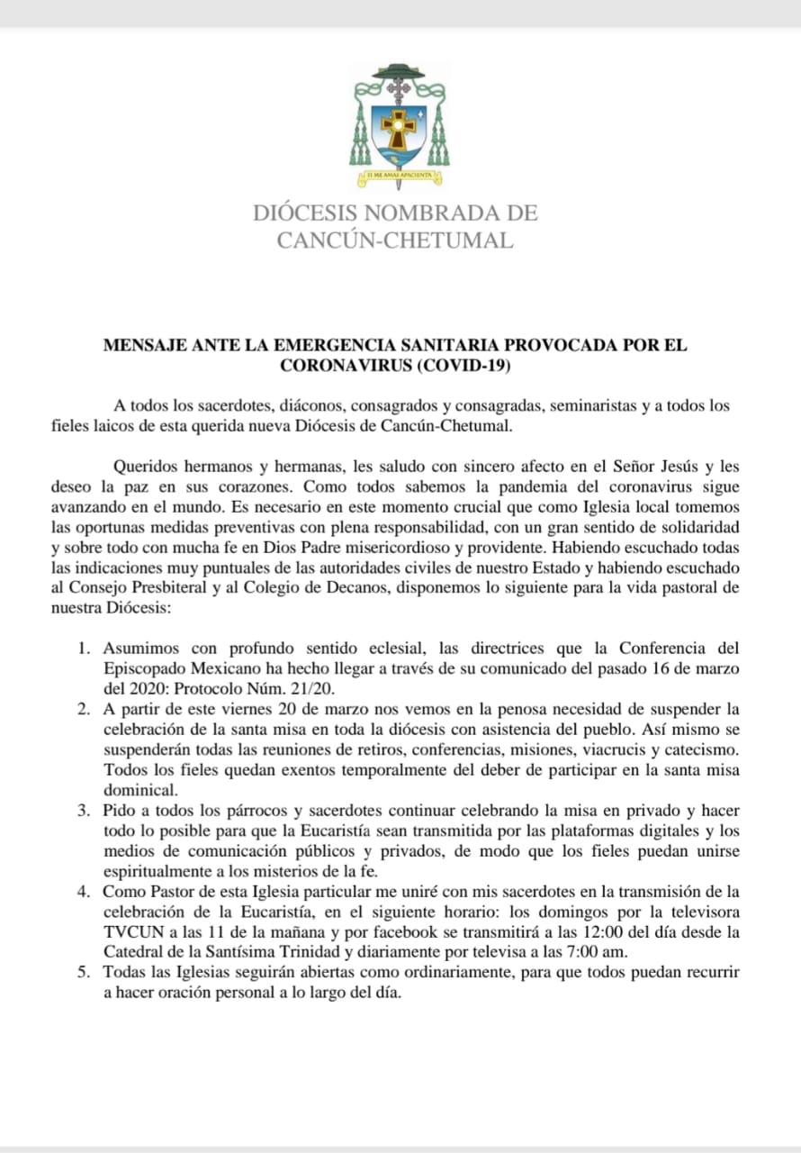 Comunicados 200318-Diócesis de Cancún Chetumal-Mensaje ante la emergencia sanitaria provocada por el coronavirus COVID 19 Felipe Monroy 18 Marzo 2020 Share On Facebook Share On Twitter Category Comunicados Hits 1580 times Anterior Siguiente tweet