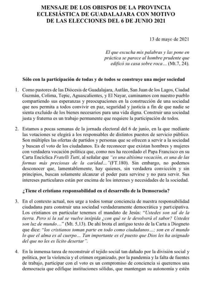 Comunicados 210513-Provincia Eclesiástica de Guadalajara-Mensaje con motivo de las elecciones del 6 de junio 2021 Felipe Monroy 13 May 2021 Share On Facebook Share On Twitter Category Comunicados Hits 1617 times Prev Next tweet