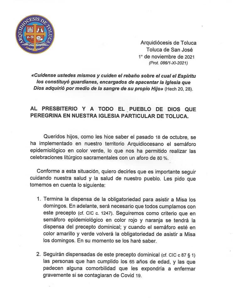 Comunicados 211101-Arquidiócesis de Toluca-Termina la dispensa de la obligatoriedad para asistir a Misa los domingos Felipe Monroy 01 November 2021 Share On Facebook Share On Twitter Category Comunicados Hits 1814 times Prev Next tweet