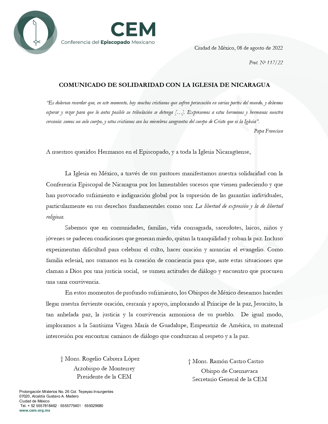 Comunicados 220808 - Conferencia del Episcopado Mexicano - Solidaridad con la Iglesia de Nicaragua Felipe Monroy 08 August 2022 Share On Facebook Share On Twitter Category Comunicados Hits 2307 times Prev Next tweet