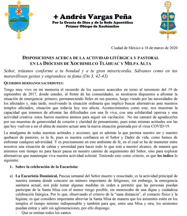 Comunicados 200318-Diócesis de Xochimilco-Disposiciones acerca de la actividad litúrgica y pastoral en la Diócesis Felipe Monroy 18 March 2020 Share On Facebook Share On Twitter Category Comunicados Hits 1733 times Prev Next tweet