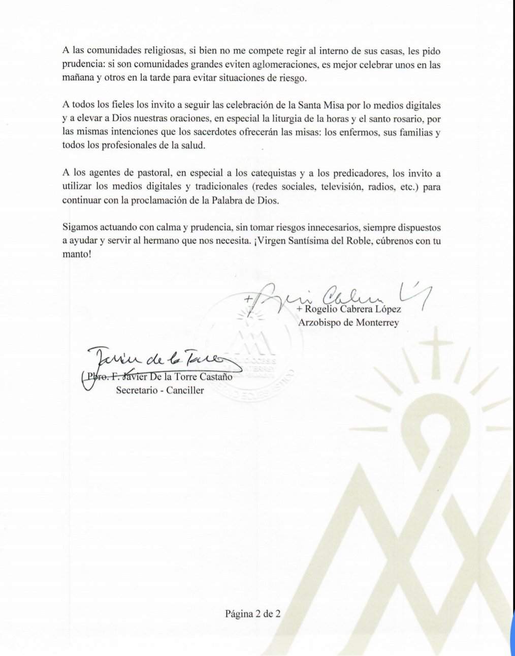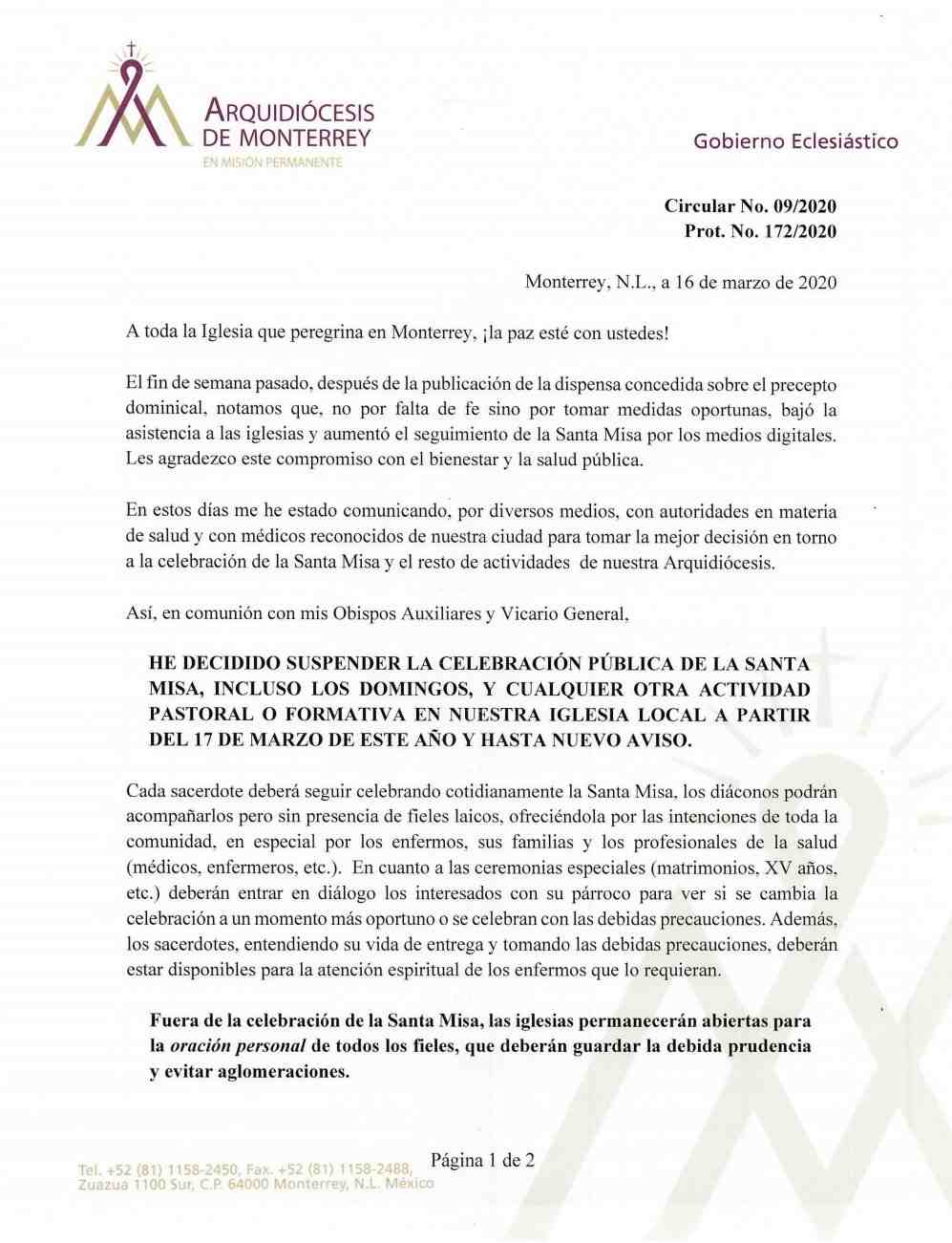 Comunicados 200316-Arquidiócesis de Monterrey-Después de la dispensa concedida sobre el precepto dominical Felipe Monroy 16 March 2020 Share On Facebook Share On Twitter Category Comunicados Hits 1809 times Prev Next tweet