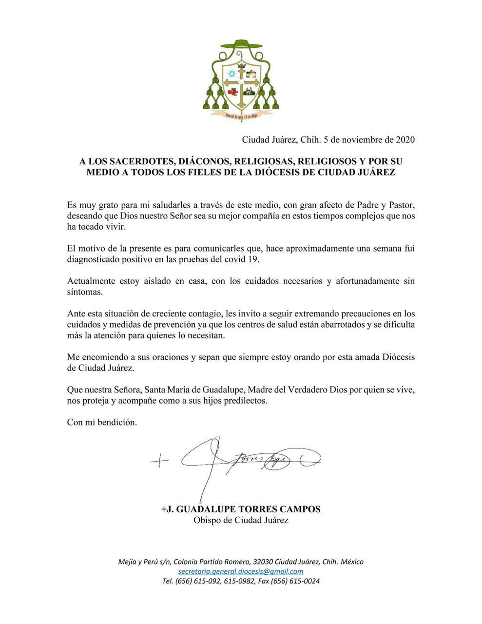 Comunicados 201105-Diócesis de Ciudad Juárez-Obispo Torres Campos diagnosticado con COVID Felipe Monroy 05 November 2020 Share On Facebook Share On Twitter Category Comunicados Hits 1780 times Prev Next tweet