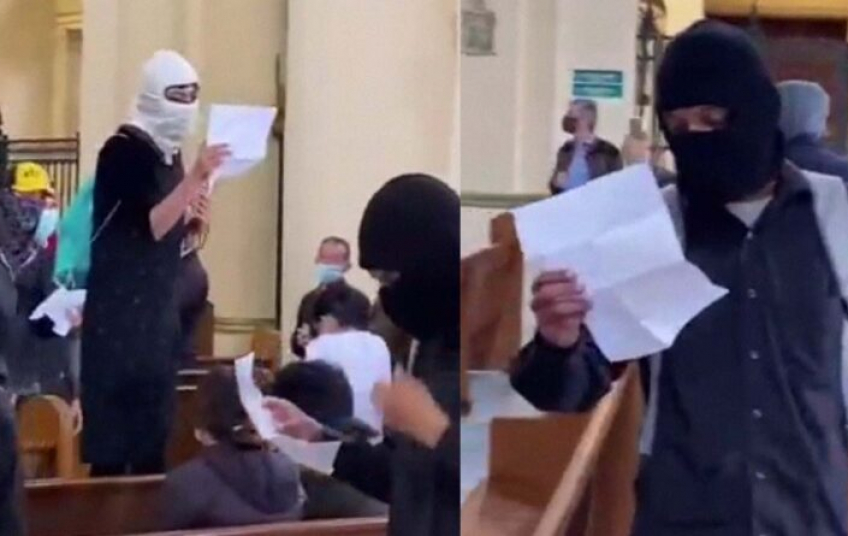 Sin embargo, durante el momento de la Comunión (el acto más relevante y sagrado para los fieles católicos), los miembros del peculiar grupo se cubrieron los rostros con pasamontañas e interrumpieron el acto litúrgico: "Se encapucharon ahí mismo, se pararon sobre las bancas y empezaron a gritar arengas", relata el párroco Jorge Marín.