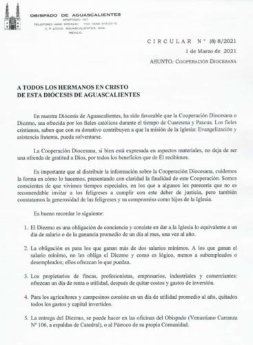 Aguascalientes, Ags.-Mediante una circular oficial del obispado de Aguascalientes en sede vacante, los sacerdotes en espera que el papa Francisco nombre sucesor al finado José María de la Torre Martín han pedido a los fieles que recuerden hacer su aportación del Diezmo 2021 pues "es una obligación de conciencia".
