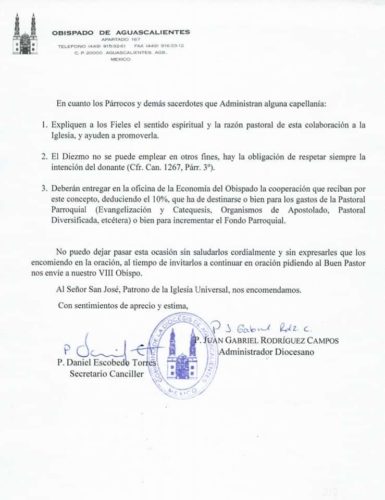 El oficio que invita a la aportación del diezmo está firmada por el administrador diocesano temporal, Juan Gabriel Rodríguez Campos, en la que se señala estar conscientes de los "tiempos especiales que se viven" y que, por ello, el diezmo es una obligación de conciencia y consiste en dar a la iglesia lo equivalente a un día de salario o de la ganancia promedio de un día al mes, una vez al año.