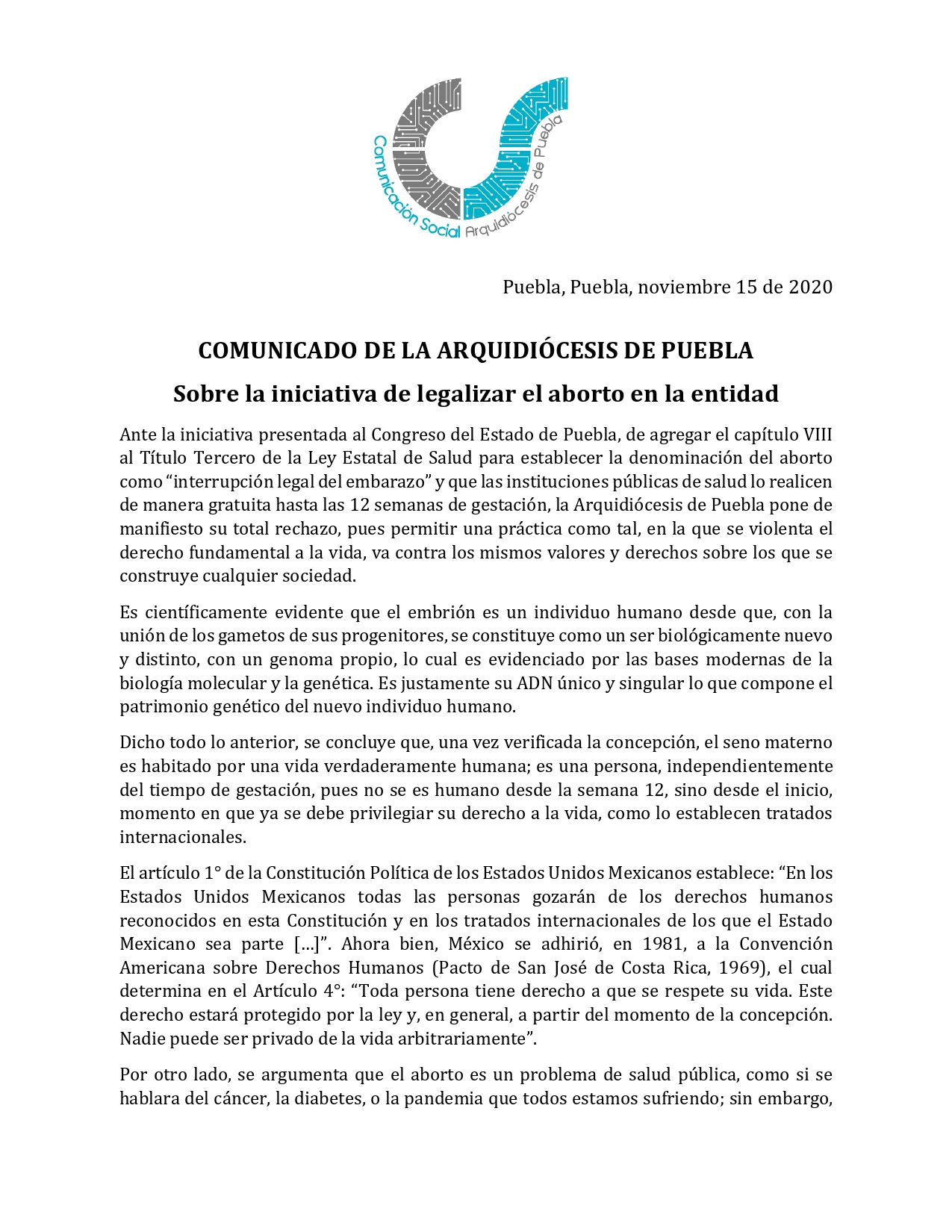 COMUNICADO: Arquidiócesis de Puebla- Sobre la iniciativa de legalizar el aborto en la entidad