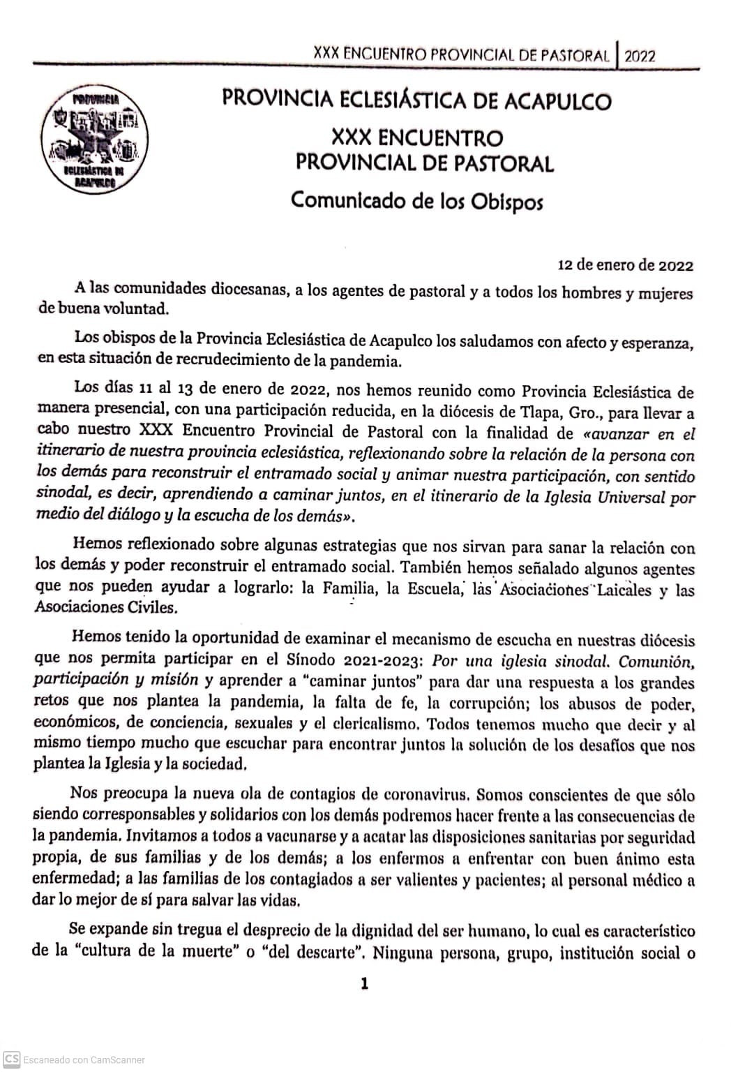 Tlapa, Guerrero.- Debido a que "se expande sin tregua el desprecio de la dignidad del ser humano", resurge una nueva ola de contagios de COVID y la violencia en el estado de Guerrero no cede, los obispos de la provincia eclesiástica de Acapulco (Acapulco, Chilpancingo-Chilapa, Ciudad Altamirano y Tlapa) han hecho un llamado a la comunión, la participación, la misión y a caminar juntos "para dar una respuesta a los grandes retos que nos plantea la pandemia, la falta de fe, la corrupción; los abusos de poder, económicos, de conciencia, sexuales y el clericalismo".