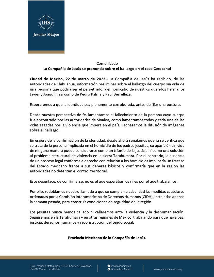 Ciudad de México.- Tras el descubrimiento del cuerpo sin vida de José Noriel Portillo Gil 'El Chueco', asesino de los sacerdotes jesuitas Javier Campos y Joaquín Mora así como de otros dos ciudadanos en junio del 2022, la Compañía de Jesús en México rechazó toda celebración del asesinato del perpetrador de los hechos y adelantó que continuarán esfuerzos por la paz en la región tarahumara.
